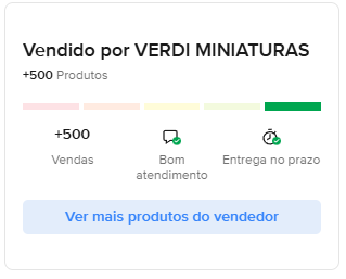 A Verdi Miniaturas possui mais de 500 vendas realizadas no Mercado Livre nos últimos 30 dias, com indicadores positivos de atendimento e entrega dentro do prazo.