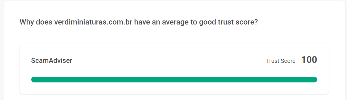 De acordo com o serviço de análise de sites ScamAdviser, o site verdiminiaturas.com.br possui pontuação máxima de confiança, sendo classificado como “Very Likely Safe”